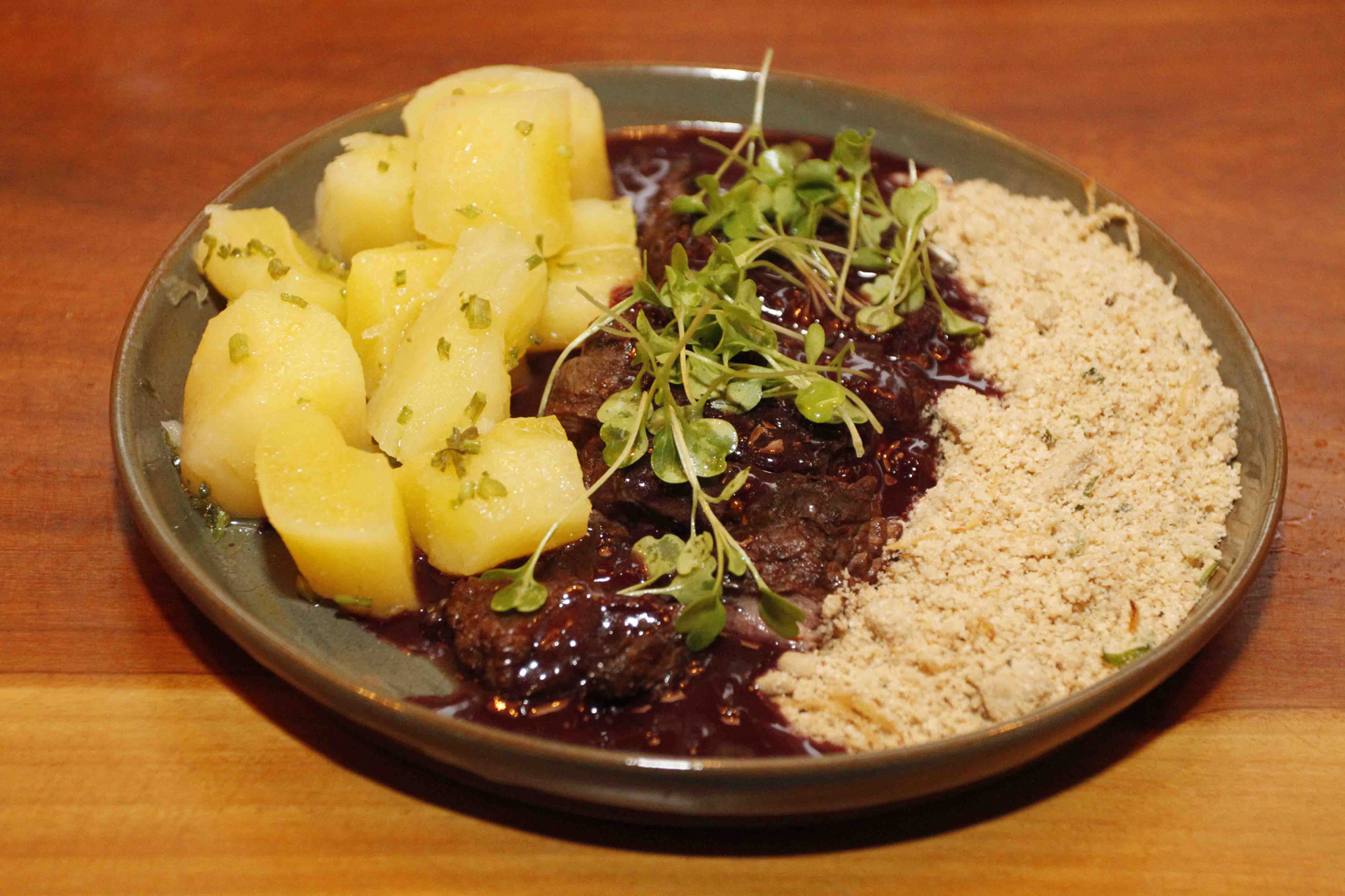 mandioca na manteiga, farofa crocante de amendoim, molho de vinho e