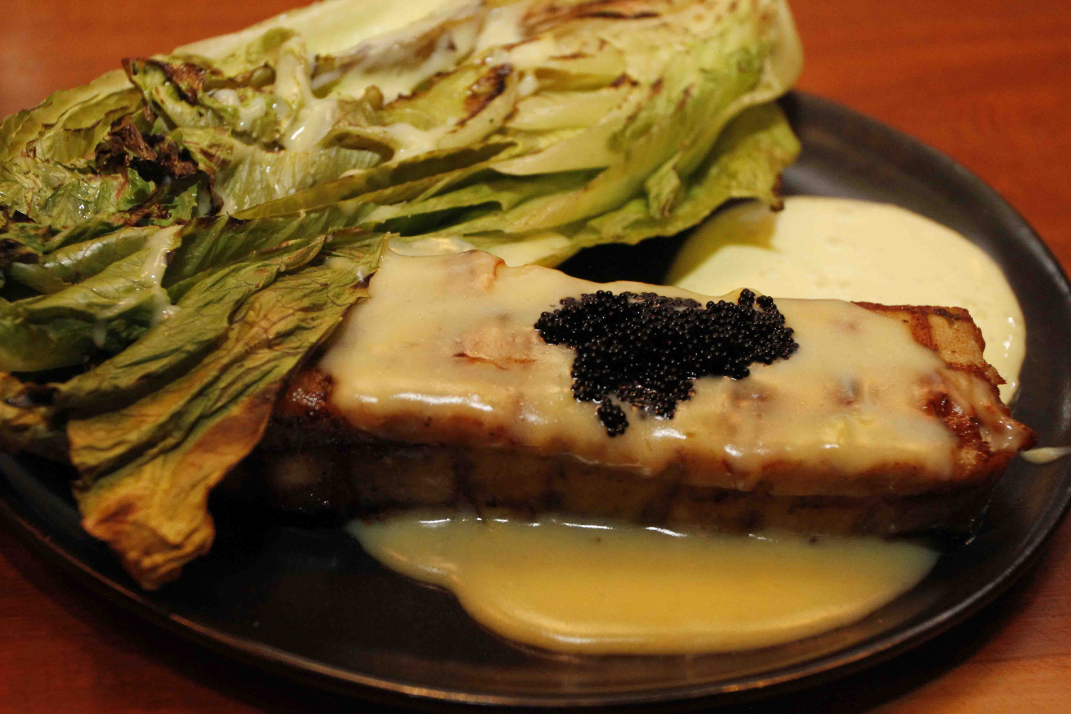 com ovas de peixe, servido com alface americana selada na brasa, ao