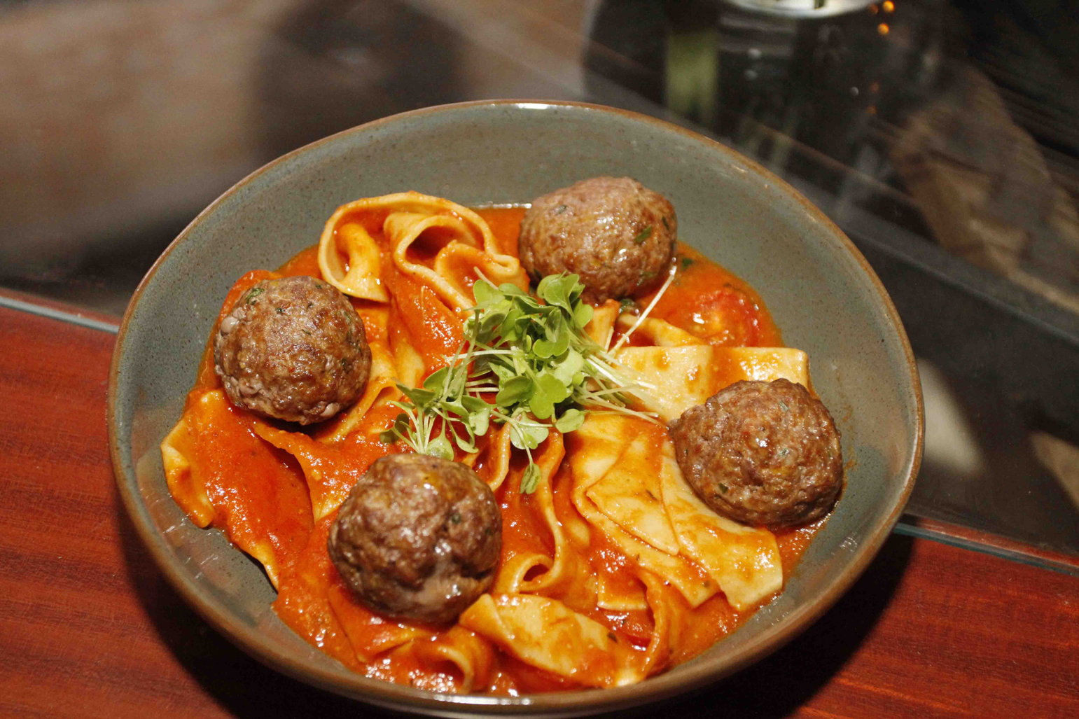 pappardelle com almôndegas, servida com pasta artesanal ao pomodoro